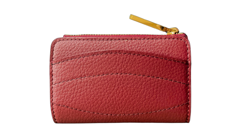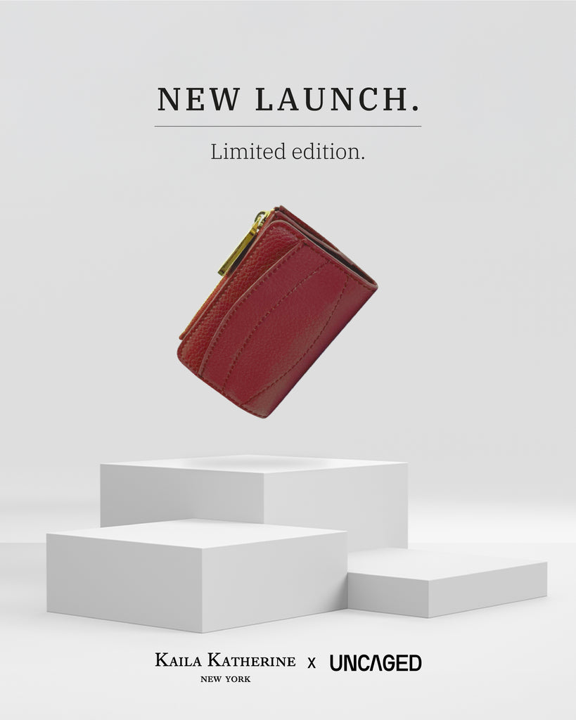 The Soho in Cherry by Kaila Katherine is a sophisticated and elegant red vegan leather wallet, with a snap closure, zipper pouch, and cardholders. Two card slots are featured internally, as well as one externally.